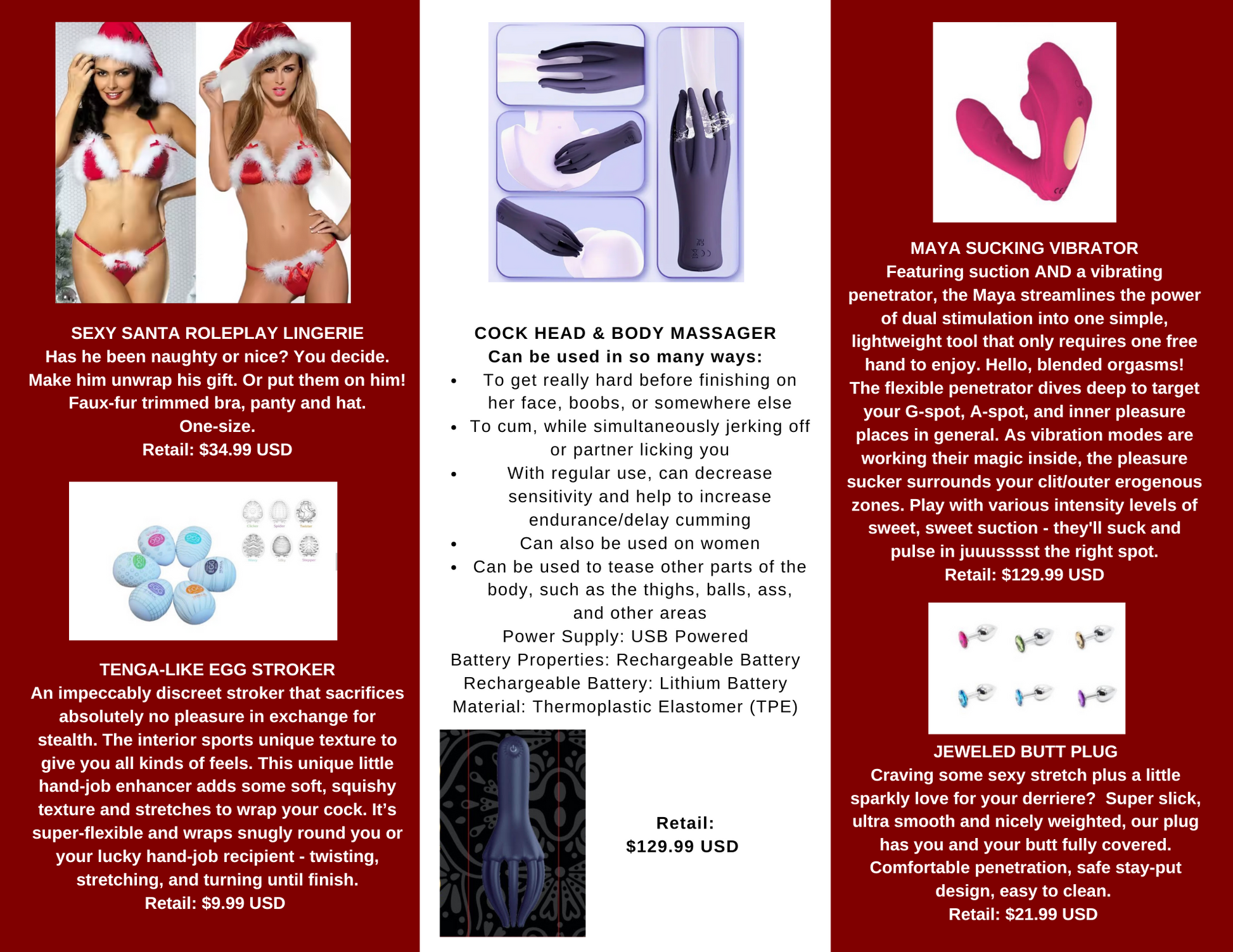 - Powered teaser toy for men; Sucking and penetrating vibrator for women; One-size lingerie; egg stroker; jeweled booty plug