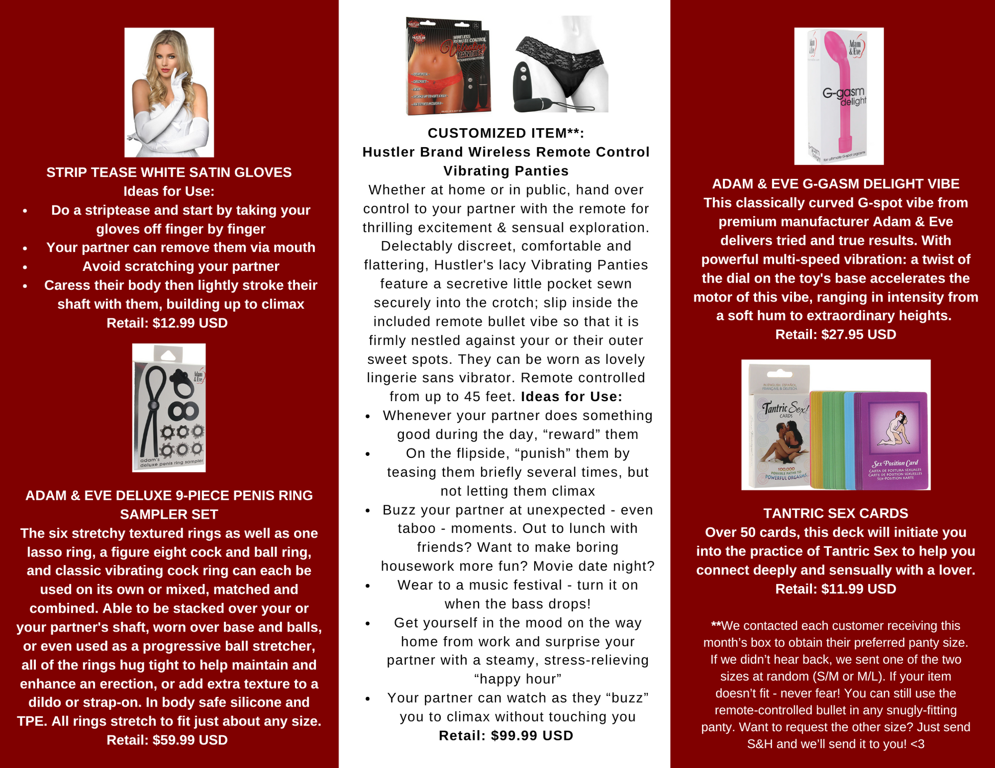 - 9-piece cock ring pack; Calexotics G-spot vibe and separate 2 AA batteries; Pack of 50 Tantric Sex instructional cards; 2-piece satin gloves (brochure includes links for how to do a striptease with gloves - can also be used for a handy); Remote-controlled panties with removable bullet vibe (please email your preference for S/M, M/L, or another item - or we can select for you)