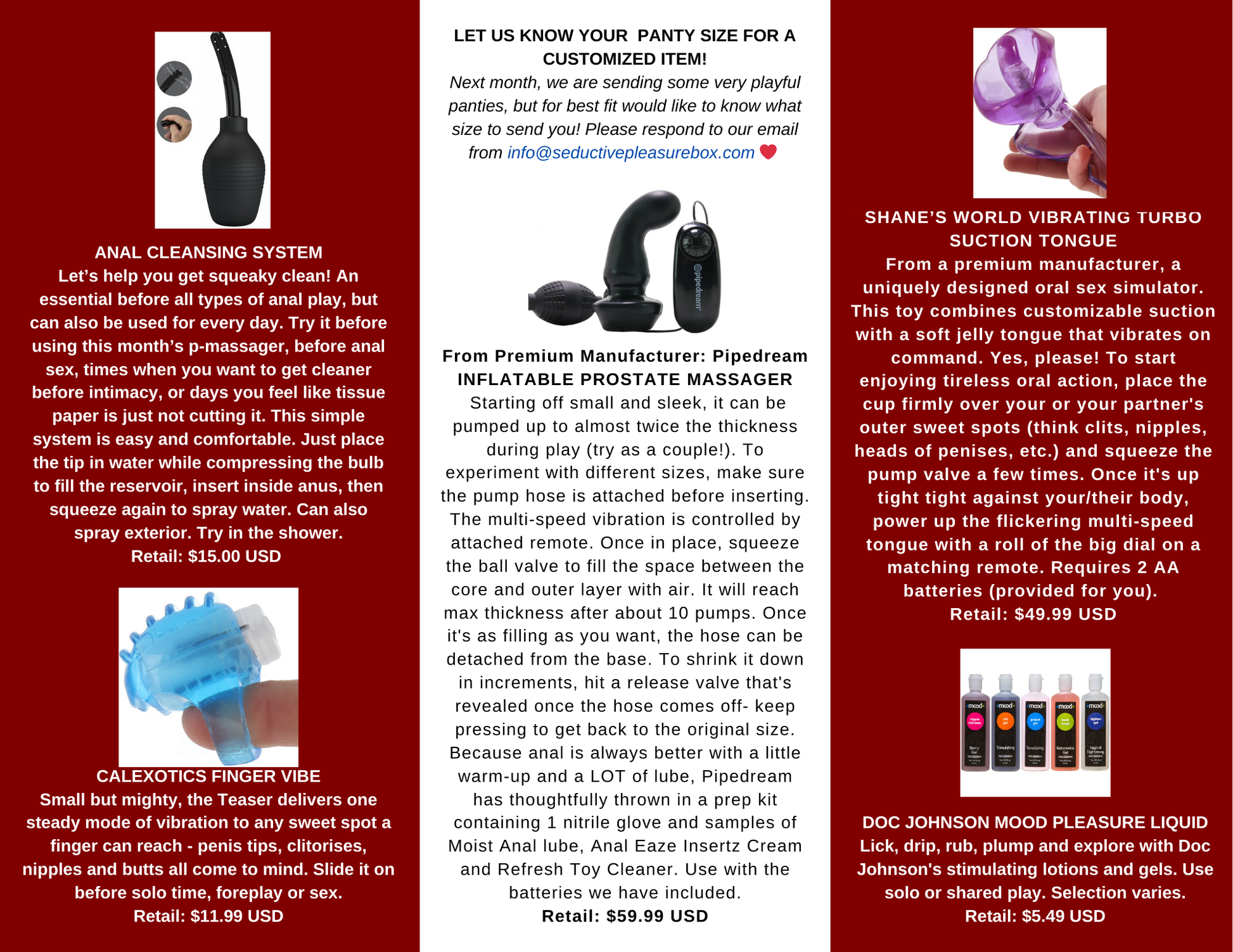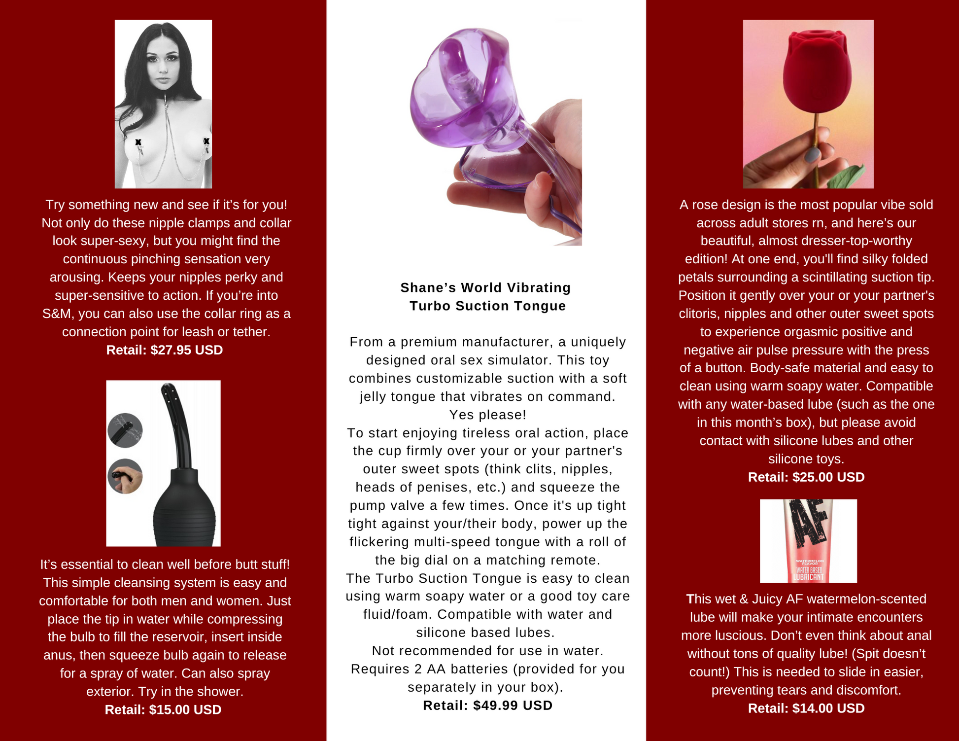 - The ever-popular Red Rose Sucking Vibrator; Shane's World Tongue Oral Simulator for men and women; Juicy AF flavored lube; Anal douche for cleansing before sex or anytime you want to feel squeaky clean; Nipple clamps (stimulate the breasts without constantly touching them... plus, it looks pretty hot!)