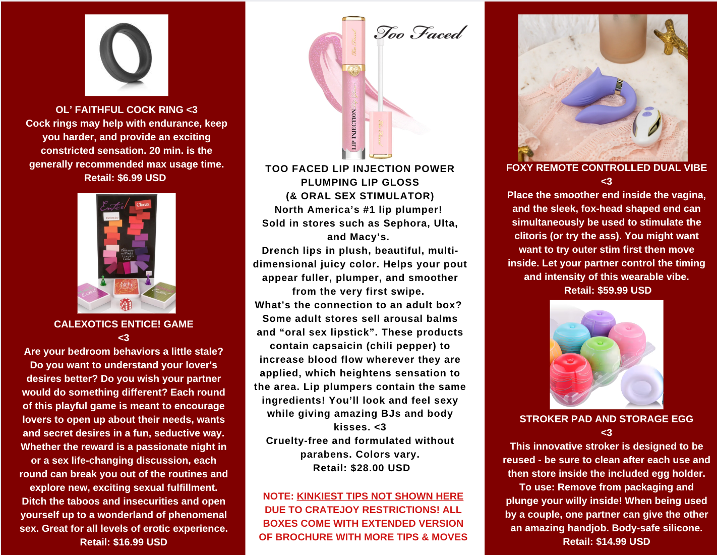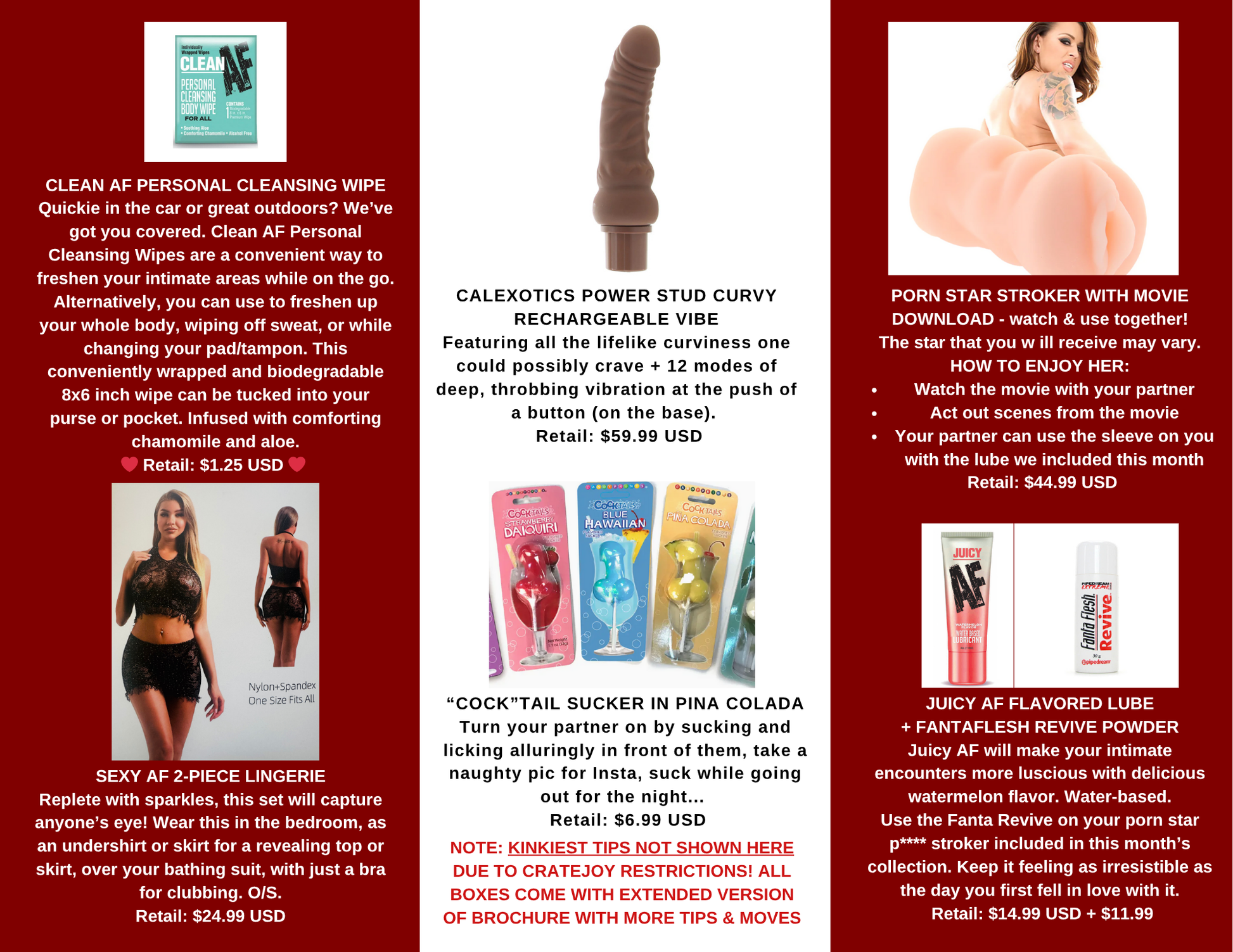 - CalExotics PowerStud Curvy Vibe; Men's Premium Stroker from Hustler; FantaFlesh to keep that stroker in good shape; lube or body drops item (brand may vary); "cock"tail penis pop sucker in Pina Colada; Clean AF personal cleansing wipes (please note that red beaded panties or another one-size lingerie item or accessory will be substituted for the black lingerie)
