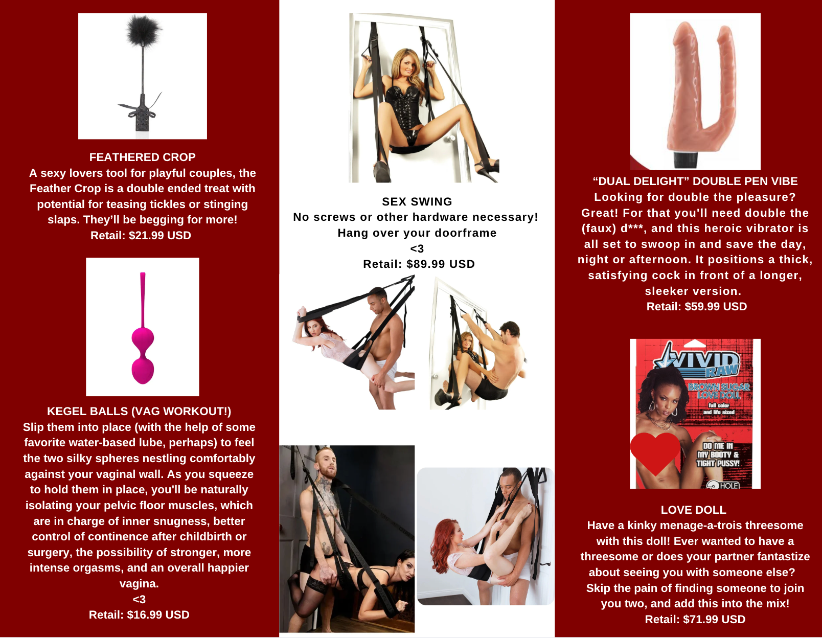 - Includes a door-hanging sex swig (no assembly needed); a blow-up doll to act out a fantasy threesome or cuckold scenario; double pen vibe; feathered crop; and Kegel balls to give your vag a workout!